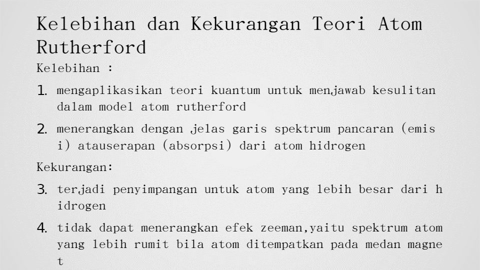 Atom adalah suatu satuan dasar materi, yang terdiri atas inti atom serta awan elektron bermuatan negatif yang mengelilinginya. Tidak dapat menerangkan efek zaeman, yaitu spektrum atom yang lebih rumit apabila atom ditempatkan pada medan magnet... Energi atom menjadi tidak stabil karena elektron yang bergerak akan memancarkan energi.